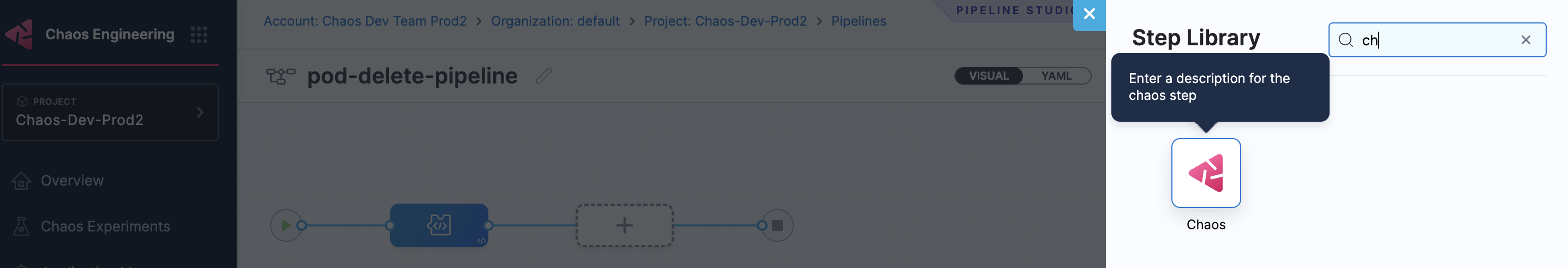 8. Choose from the list of chaos experiments, and click Add to Pipeline.