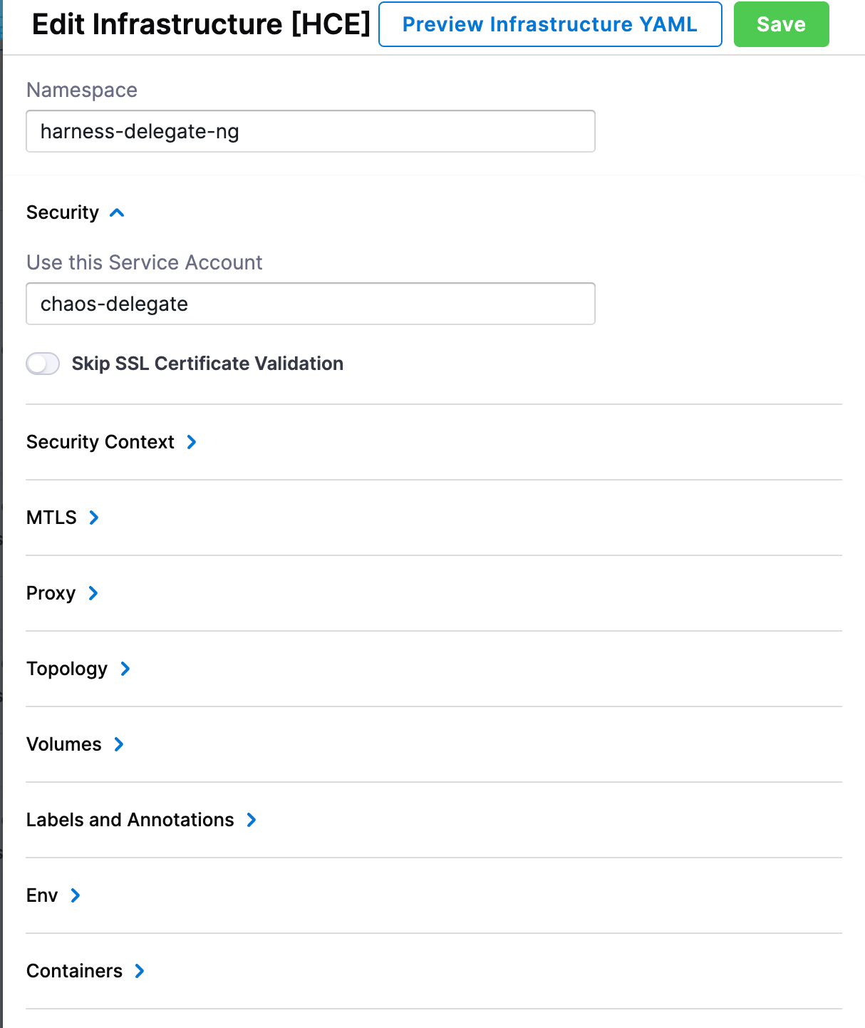 Edit the infrastructure you created in step 9 to provide the details of dedicated namespace that was created earlier. This is the namespace where the chaos runner will be launched along with the Service Account to ensure that experiments run with relevant permissions.