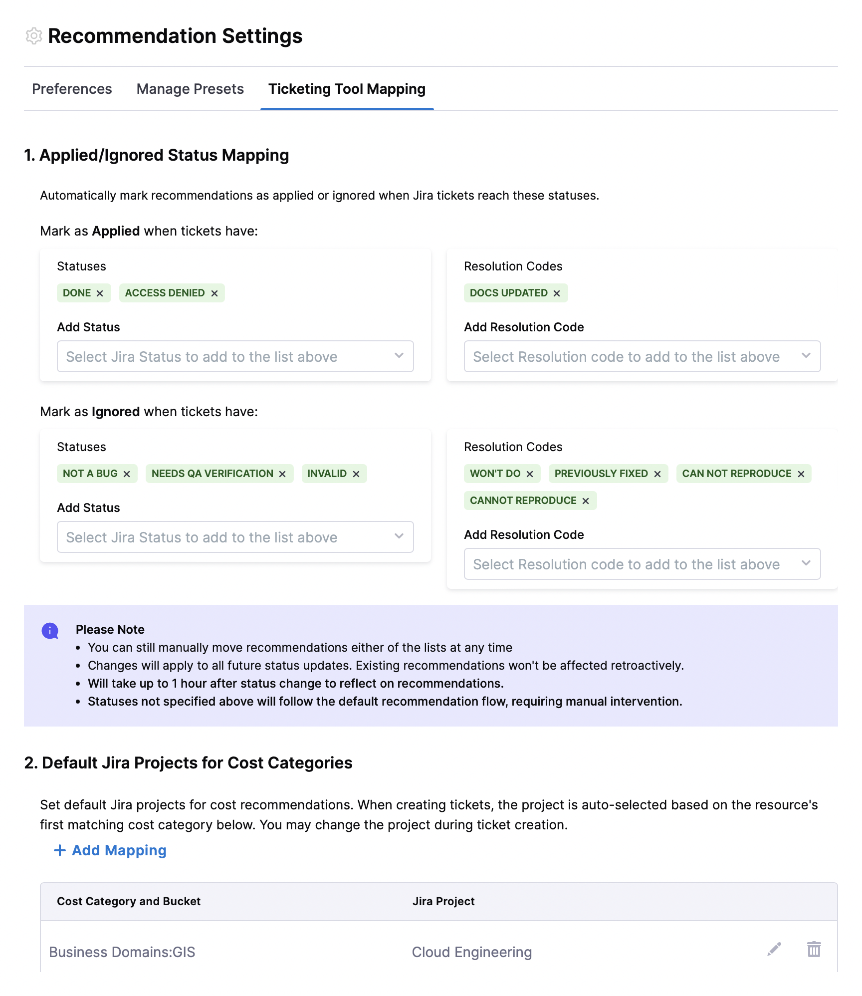Jira Statuses that move recommendation to Ignore List automatically: Choose from a list of Jira statuses. Within an hour, CCM checks if any open recommendation is linked to a Jira issue with a mapped status, the recommendation is automatically updated to Ignore List. You can also choose Resolution Codes with which the recommendation is automatically updated to Ignore List.