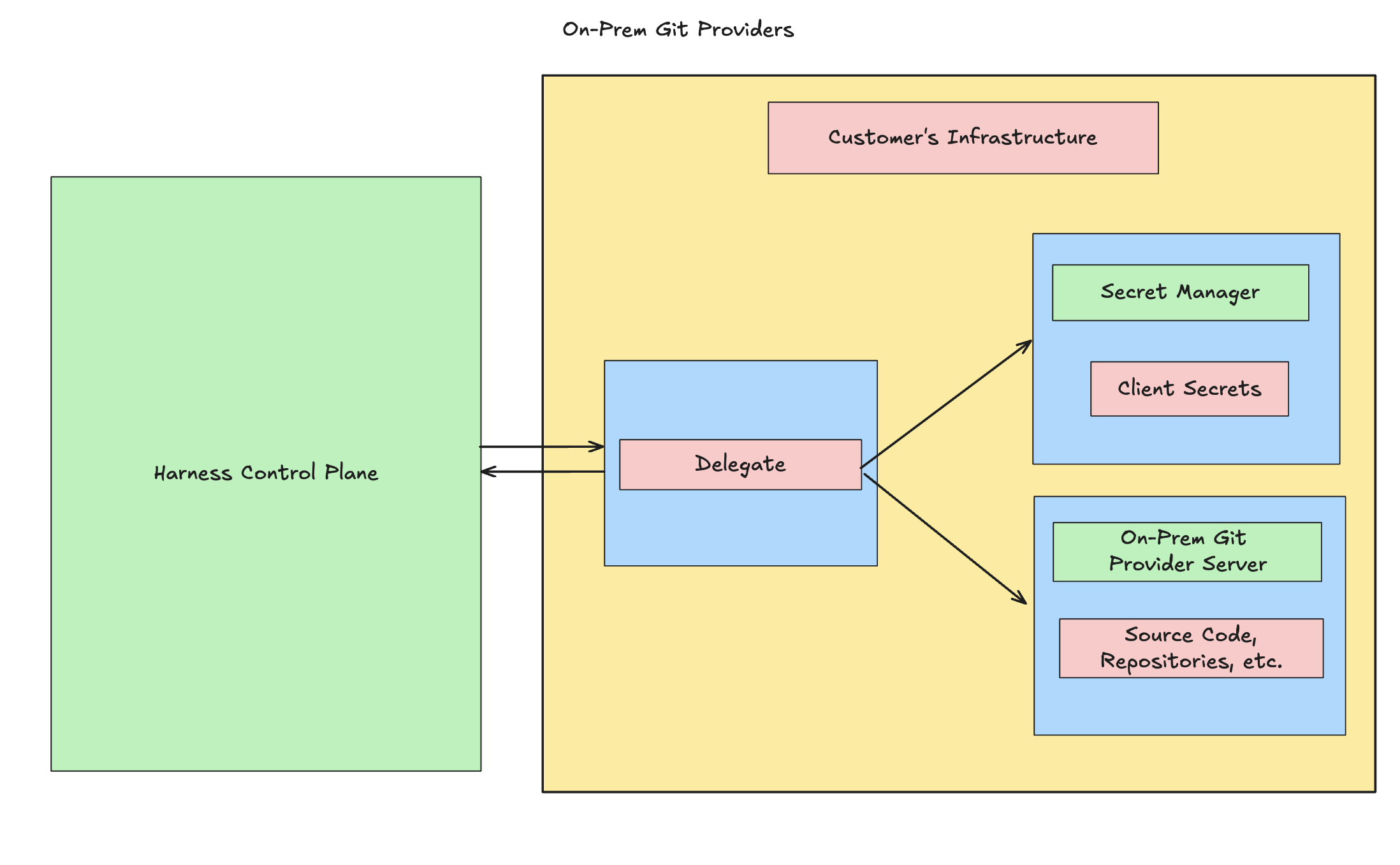 All the customer's source code, repositories, and secrets are stored in their infrastructure via on-prem Git providers and their on-prem secret managers. For the customer’s infrastructure to connect and communicate with the Harness Control Plane, a Harness Delegate must be installed. The Harness Delegate is a service you install in your infrastructure to establish and maintain a connection between the Harness Control Plane and your infrastructure. To learn more about the same, refer to delegate overview.