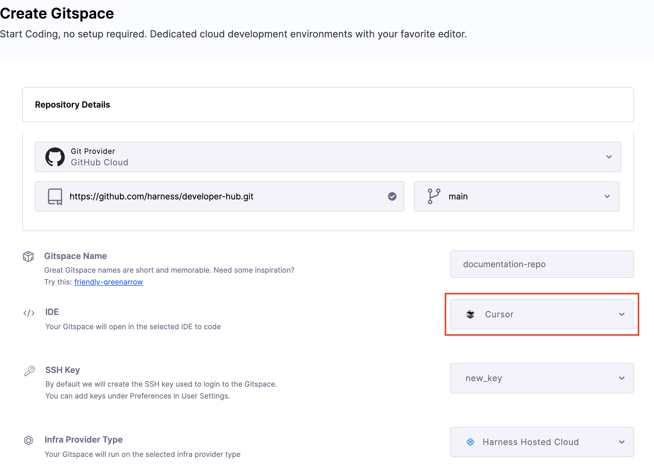 Select "Cursor" as the IDE during Gitspace creation.