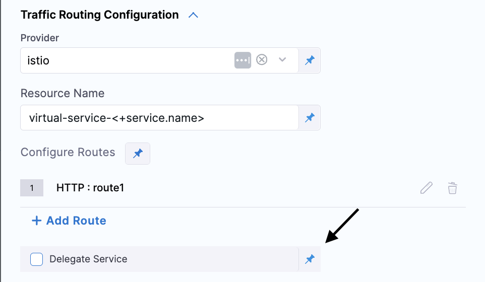 • New Config: Select this option if you want to specify a new configuration for traffic routing in this step. If configuring this in a BlueGreen deployment step or a Canary step this option is implicitly assumed. This option will create a new resource(s).