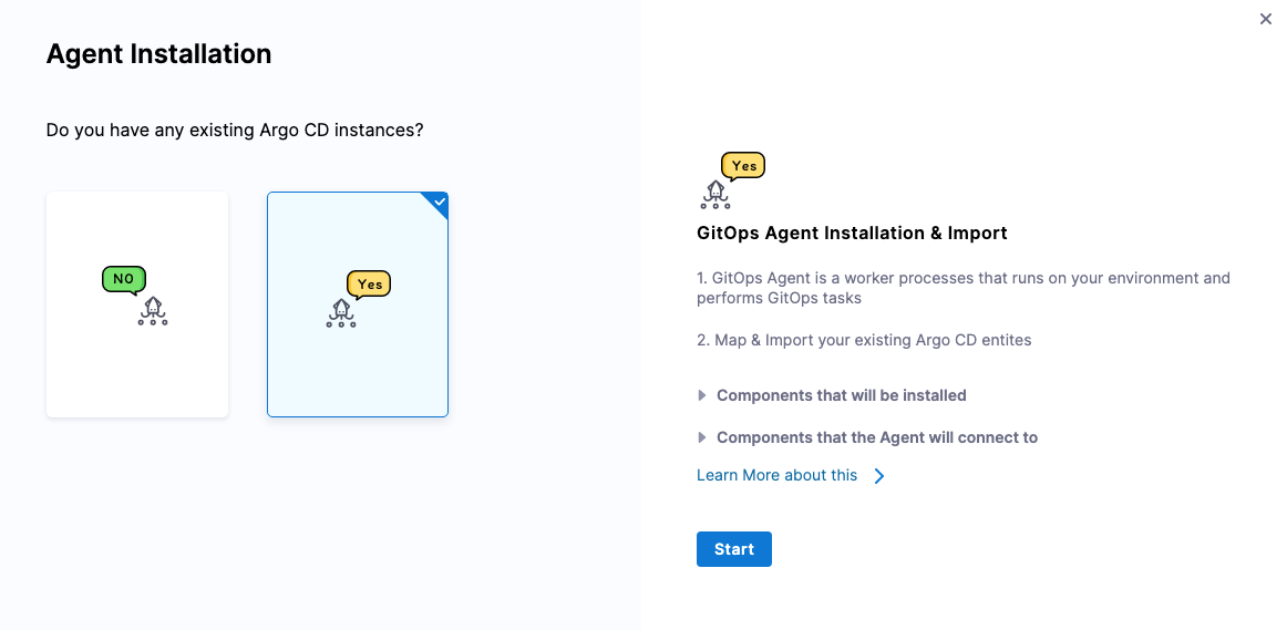 In Agent Installation, in Do you have any existing Argo CD instances, select Yes, and then select Start.