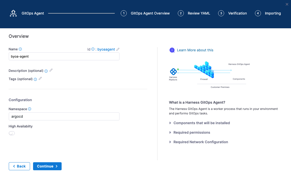 For more information, go to Install a Harness GitOps Agent.