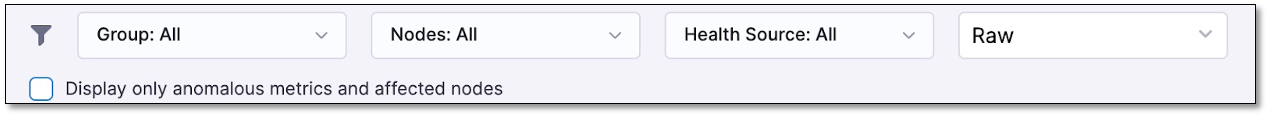 • Group: When configuring the health source, you have the flexibility to group a set of metrics together, such as a transaction group. Using the Group filter, you can filter the results based on these predefined metric groups. For health sources such as Appdynamics, New Relic, and Dynatrace, metrics are automatically grouped based on transactions, making all transactions available in the dropdown filter.