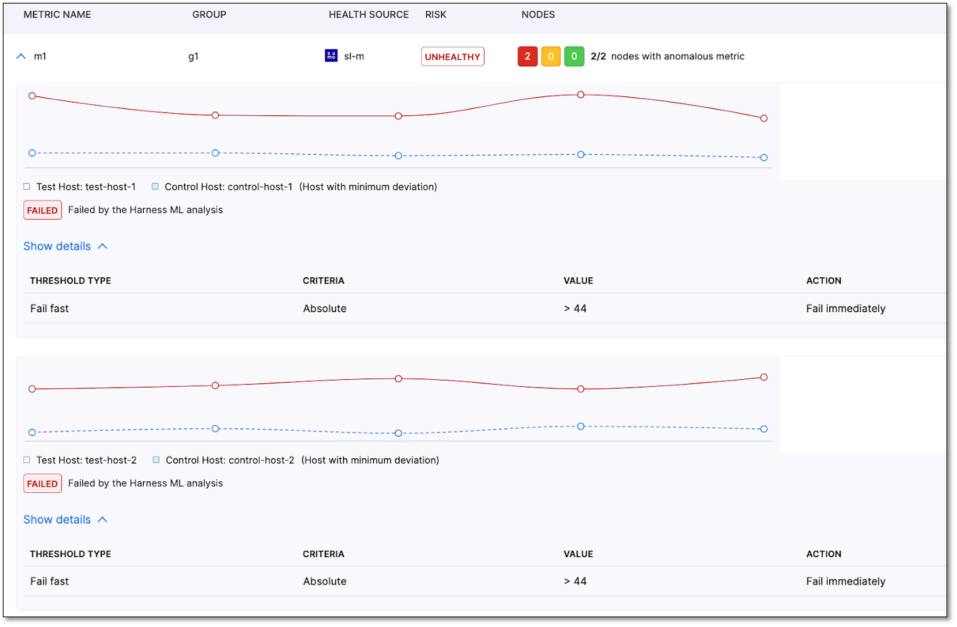 Below each graph, the results are displayed, indicating whether the metric comparison failed due to ML analysis or the metric threshold. In the given example, both nodes failed due to ML analysis. The failure occurred because of a deviation in the metric values, although the fail-fast threshold was not breached.