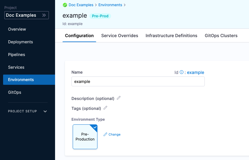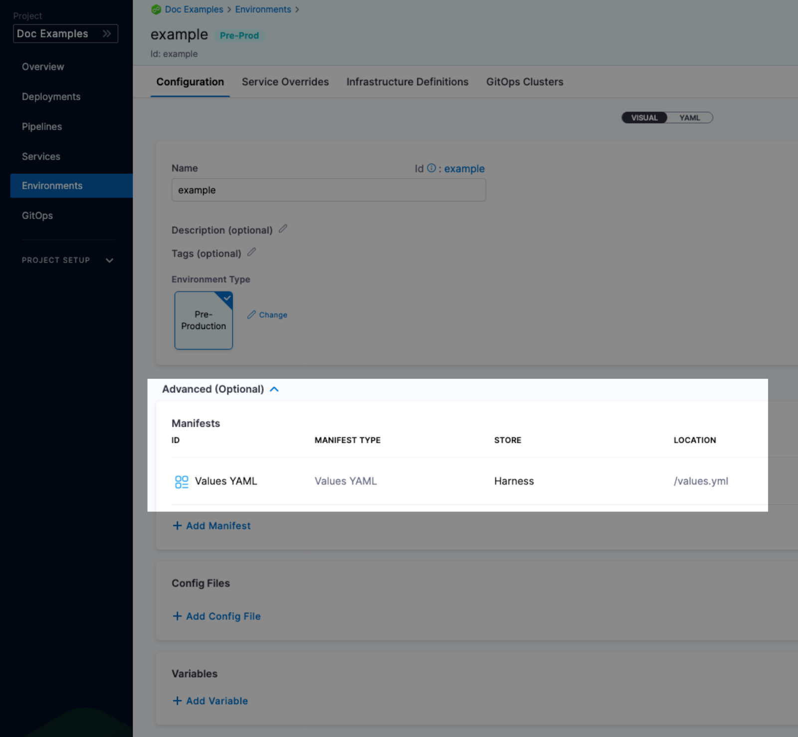 In the environment Configuration, you can also set the default manifests, config files, and variables to use whenever Harness deploys a service to this environment.