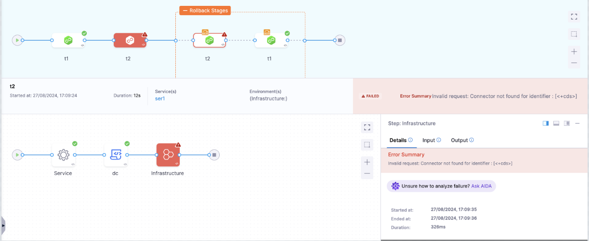 The infrastructure step will fail due to the incorrect connector reference, causing the pipeline to roll back both t2 and t1 stages.