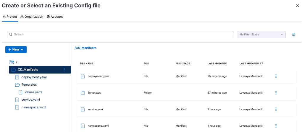 Other configuration files for other integrations, such as Azure Web Apps, etc, are supported as those integrations are released. You can access File Store from Project Setup in Harness or using the Add Manifest step during pipeline creation.
