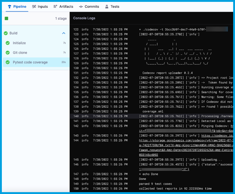 When you run your pipeline, you can review CodeCov information in the Run step's logs on the Build details page. If the results were successfully uploaded to CodeCov, the logs include a resultURL that you can follow to view the code coverage output in your CodeCov account, such as: