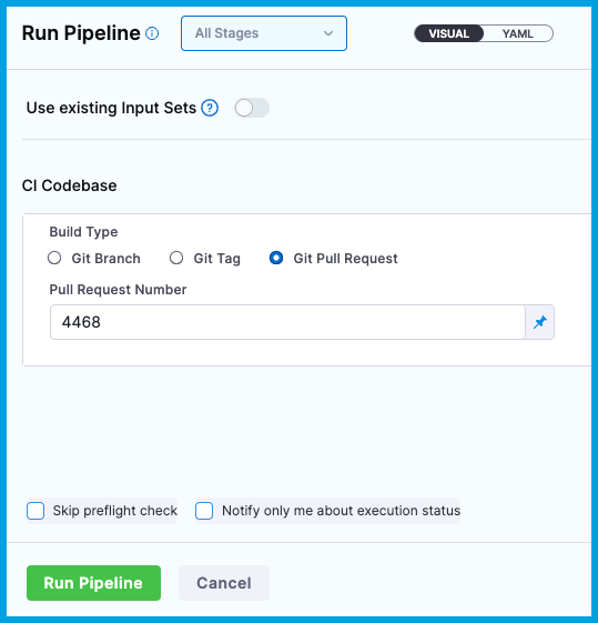 If you opened a PR, select Git Pull Request for Build Type, and enter the PR number.
