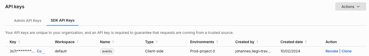 In the Admin page, under the API keys page, Make sure all Admin API and SDK keys are revoked for the project environments. For example the screenshot below shows the SDK API key for the "default" project.