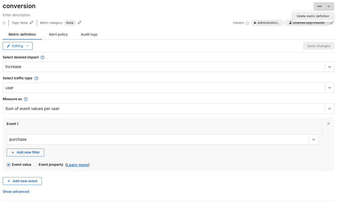 To delete metrics, click on the upper top right (...) icon to delete it.