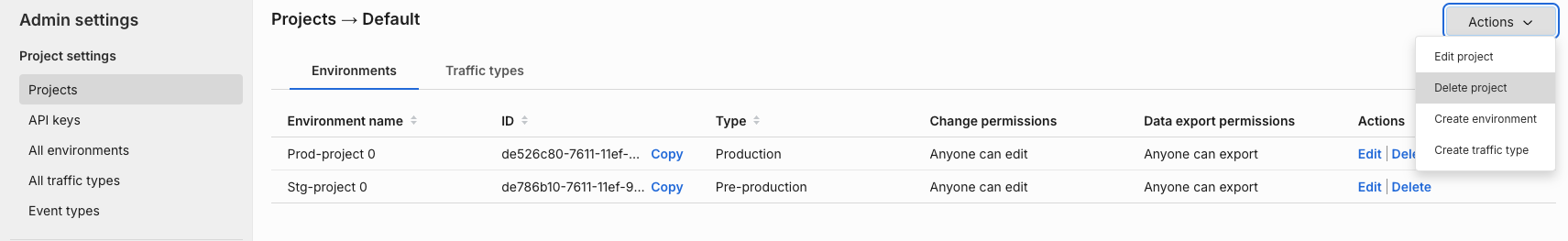 infoYou can update this setting at any time by clicking Actions > Edit project on the top right corner in Project Settings.