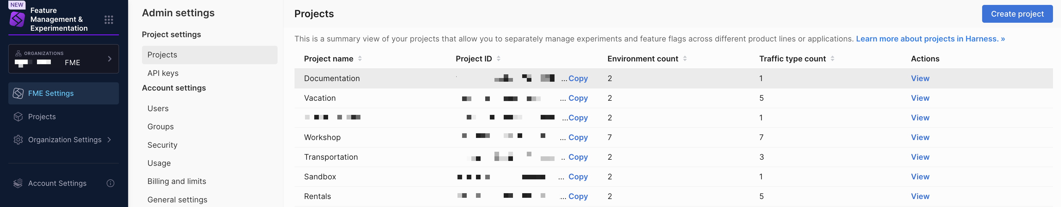 Project creation in Harness FME uses the Harness platform project workflow. After creating a project, return to FME Settings to configure FME-specific options.