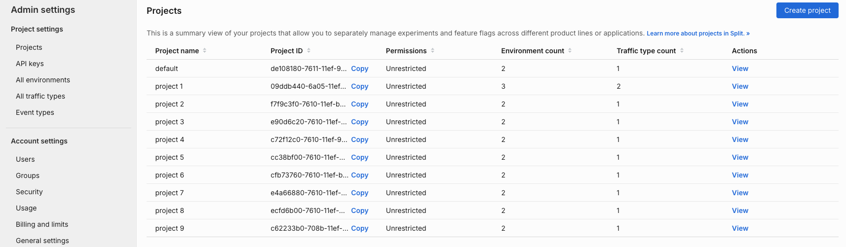 - Manage the environments and traffic types in a project by clicking View in the Actions column for selected projects.