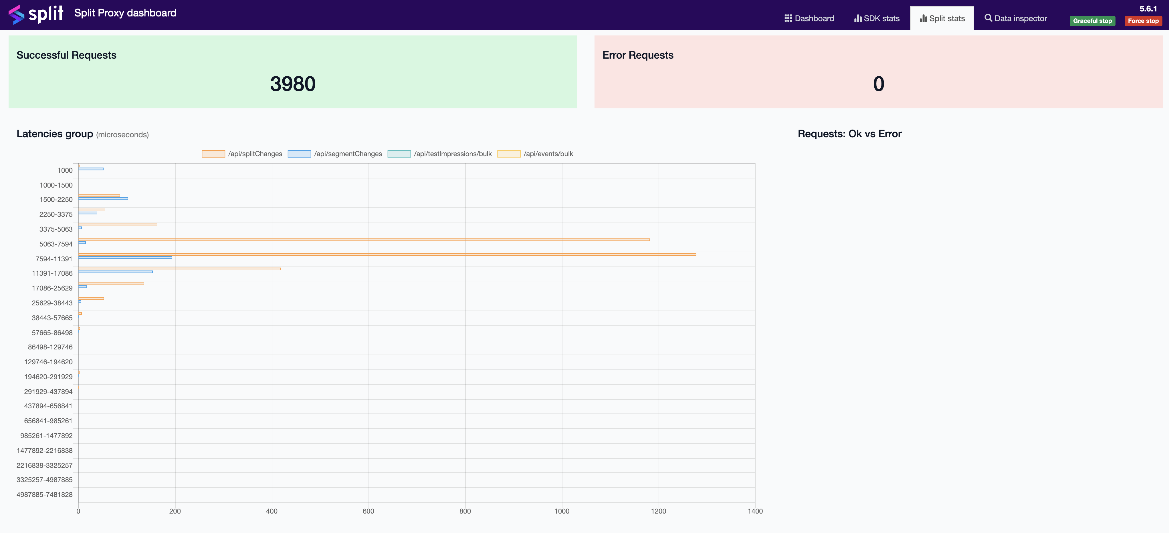 - Split stats: Metrics numbers and a latency graph, measured between proxy requests integration with Harness servers