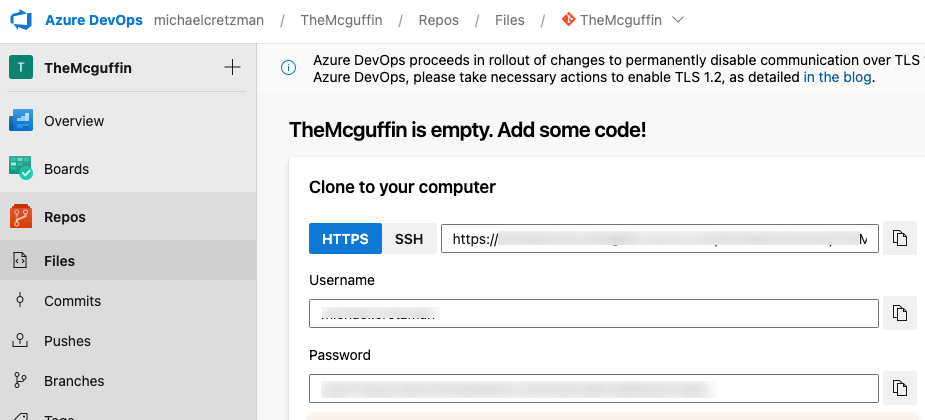 • HTTP Repository URL: https://ORG_OR_USER@dev.azure.com/ORG_NAME/PROJECT_NAME/_git/REPO_NAME