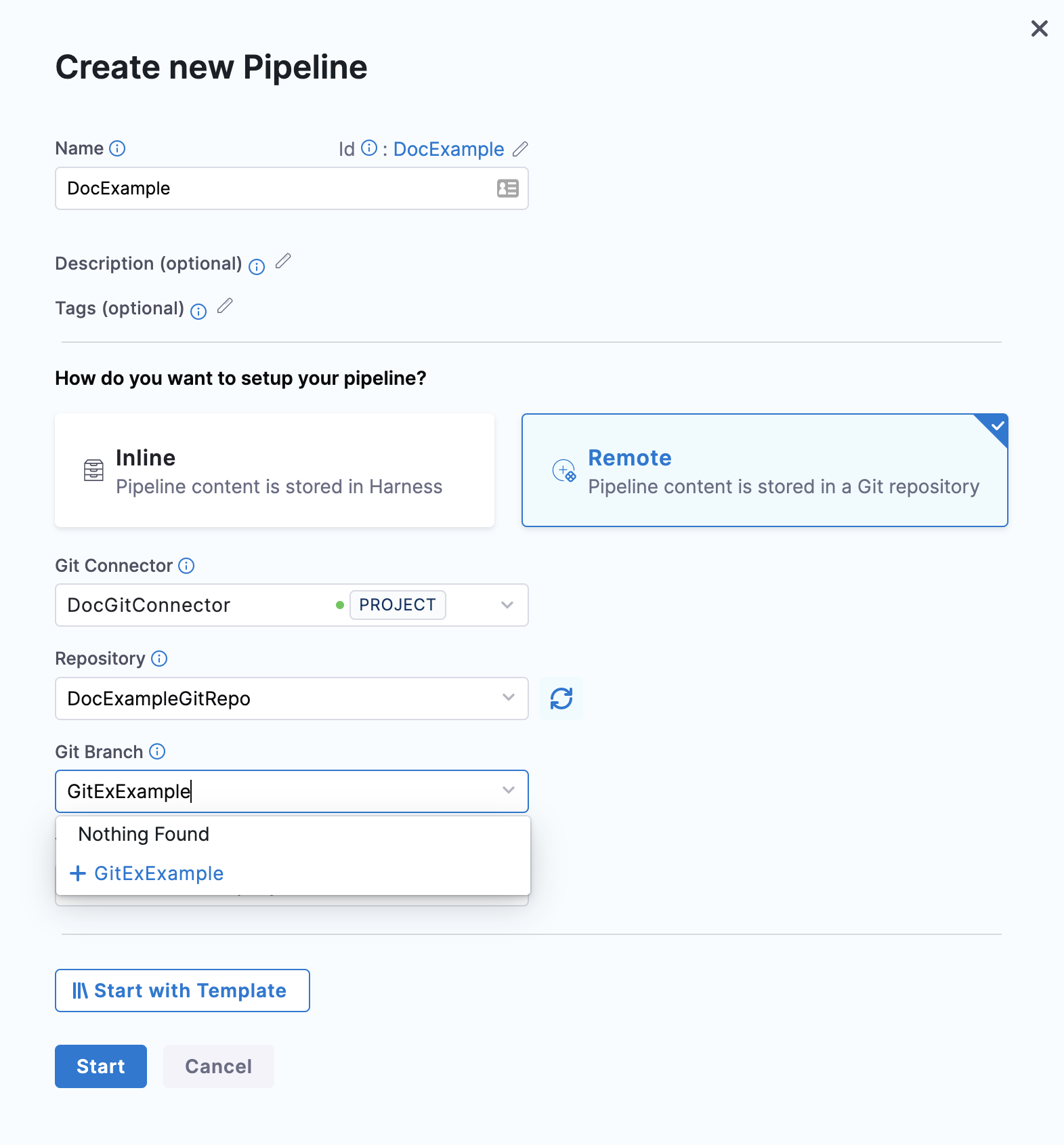Harness fetches your pipeline details from the default branch if you created your remote pipeline before version 77808. Select the corresponding branch and proceed to load a pipeline residing in a branch other than the default branch.