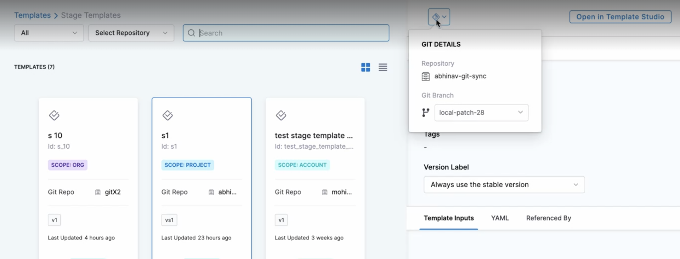 • During pipeline execution, Harness fetches the entities like templates from the same branch as the pipeline. This lets you test the templates before merging them back into the "default" branch.