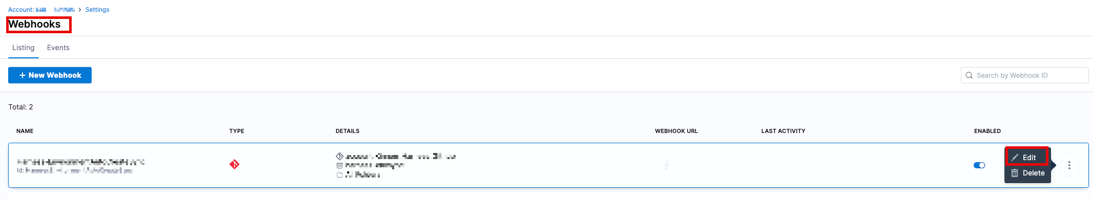 2. Locate the webhook, click on the three dots (...) and select edit