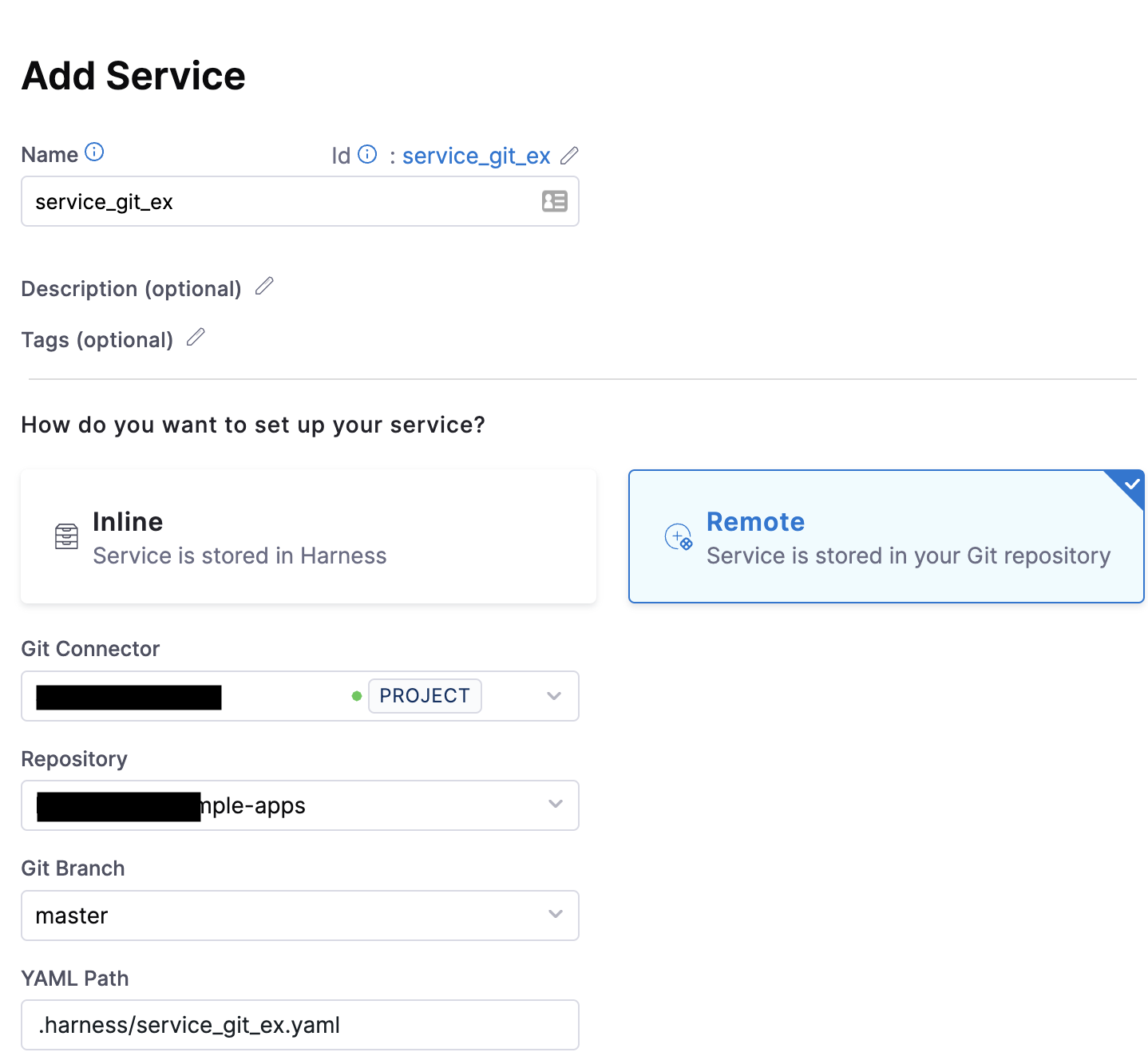 - Remote: the Harness service is stored in Git.