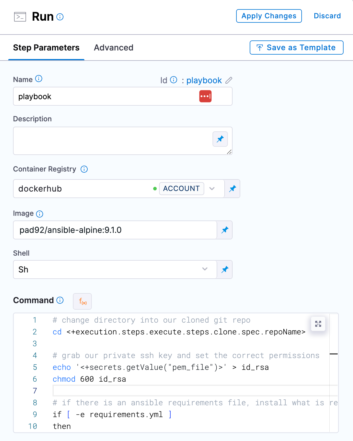 ansible-playbook --private-key=id_rsa -i <+execution.steps.ansible.variables.host_file> <+execution.steps.ansible.variables.playbook>