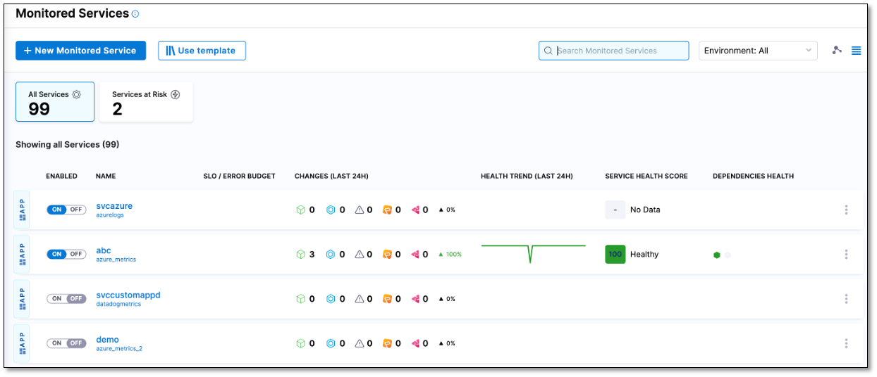 In Harness, select Service Reliability > Monitored Services. DocImage A list of monitored services is displayed. The list provides information such as the service's enablement status, name, SLO and error budget details, recent changes and health trends in the past 24 hours, health score, and health status of associated dependencies.