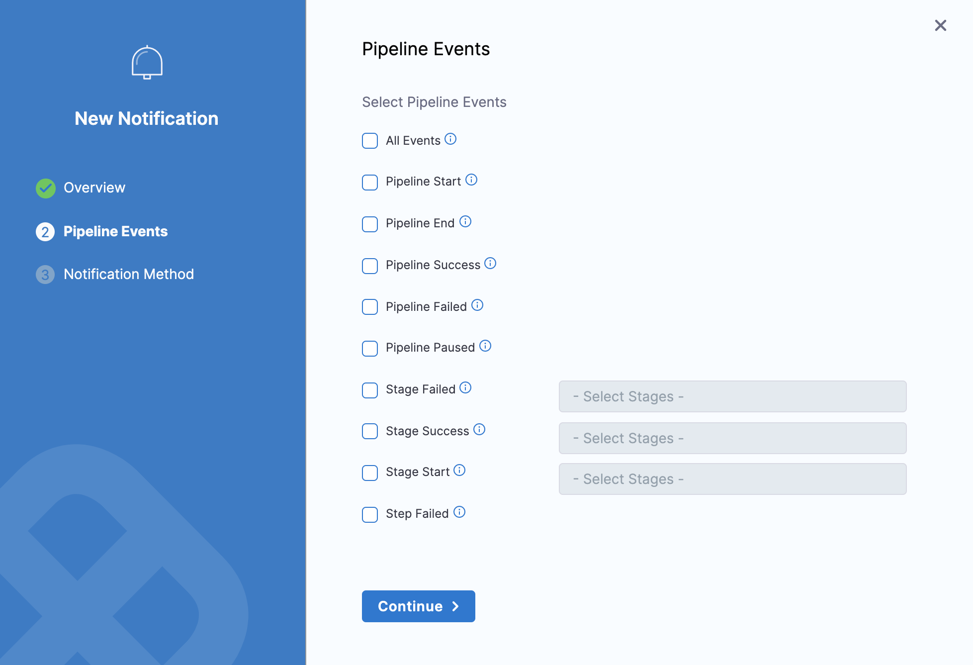 Select the Pipeline Events for which you want to send notifications. Click Continue.