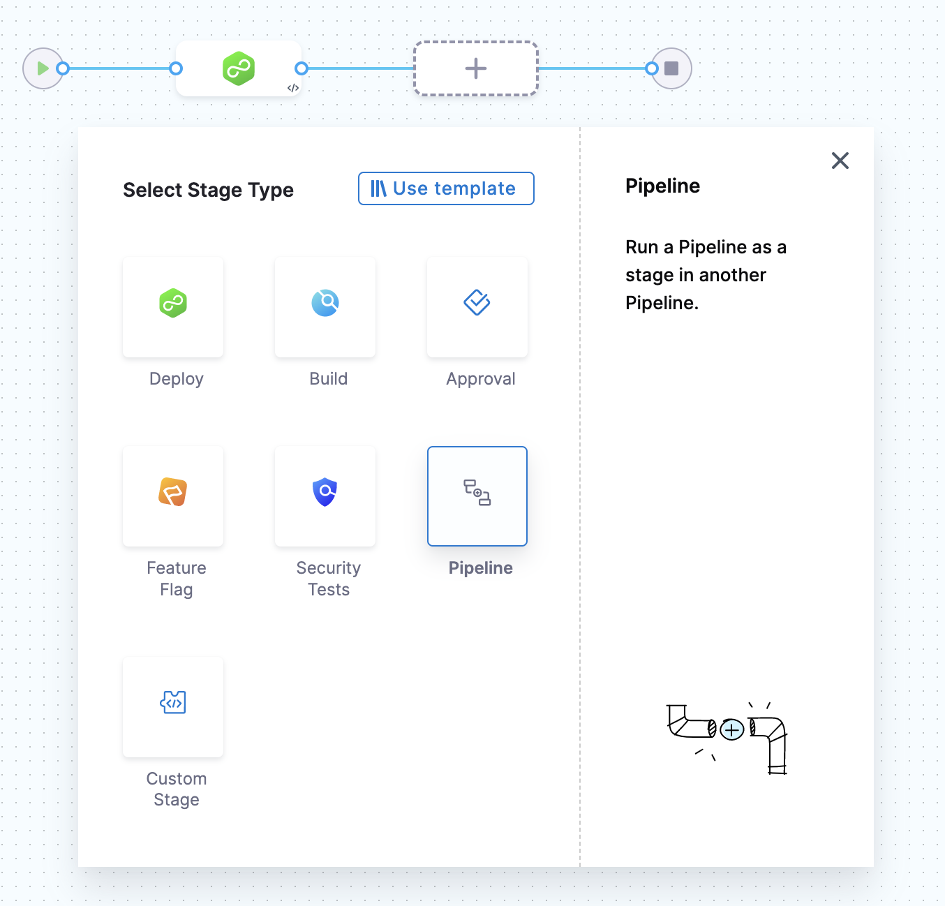 2. To chain pipelines, go to the parent pipeline, select Add Stage, and then select Pipeline.