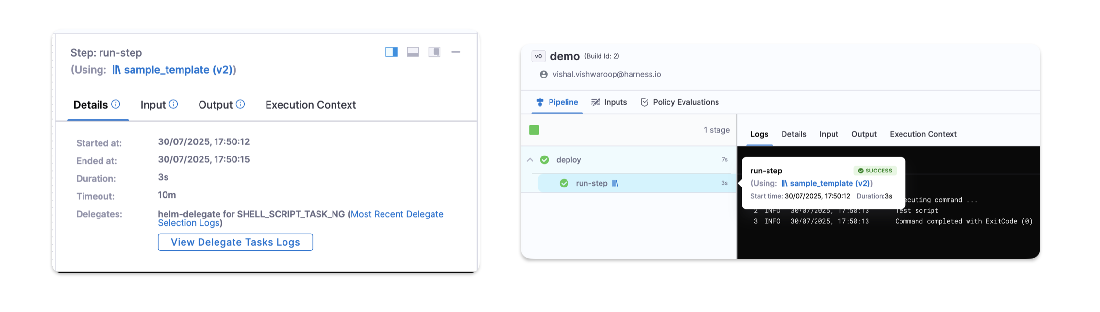 • In the log view, the step-level details display the template name and its versionLabel.