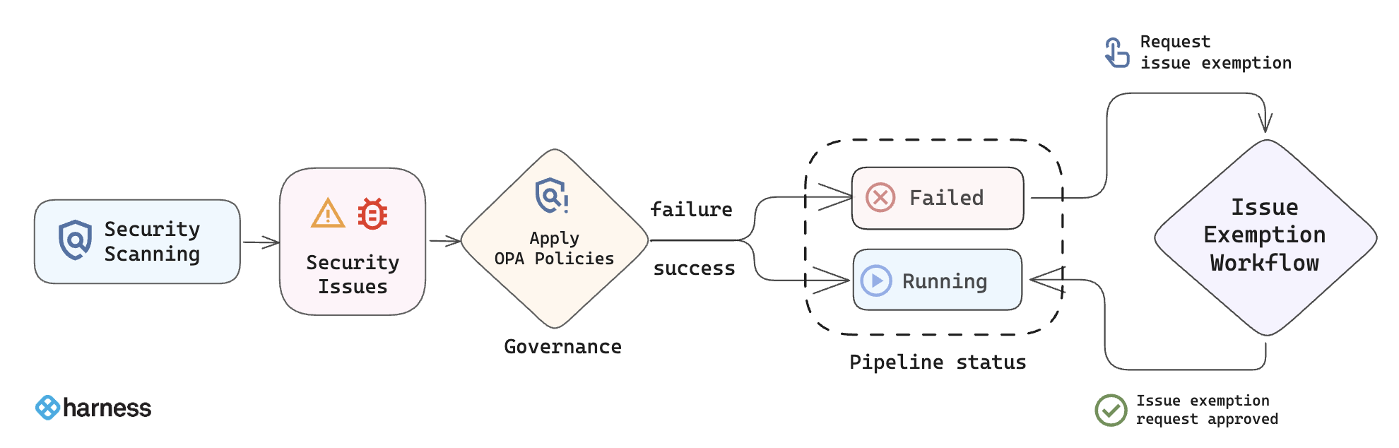 Issue Exemptions in STO provide developers and security teams a controlled method to handle security vulnerabilities detected in software delivery pipelines. When a security scan identifies a vulnerability that violates your pipeline's OPA policies, the pipeline will fail to prevent vulnerabilities from reaching production. In cases where immediate remediation isn't feasible or necessary, developers can submit exemption requests for review. Exemptions can be applied at the Project, Organization, or Account level.