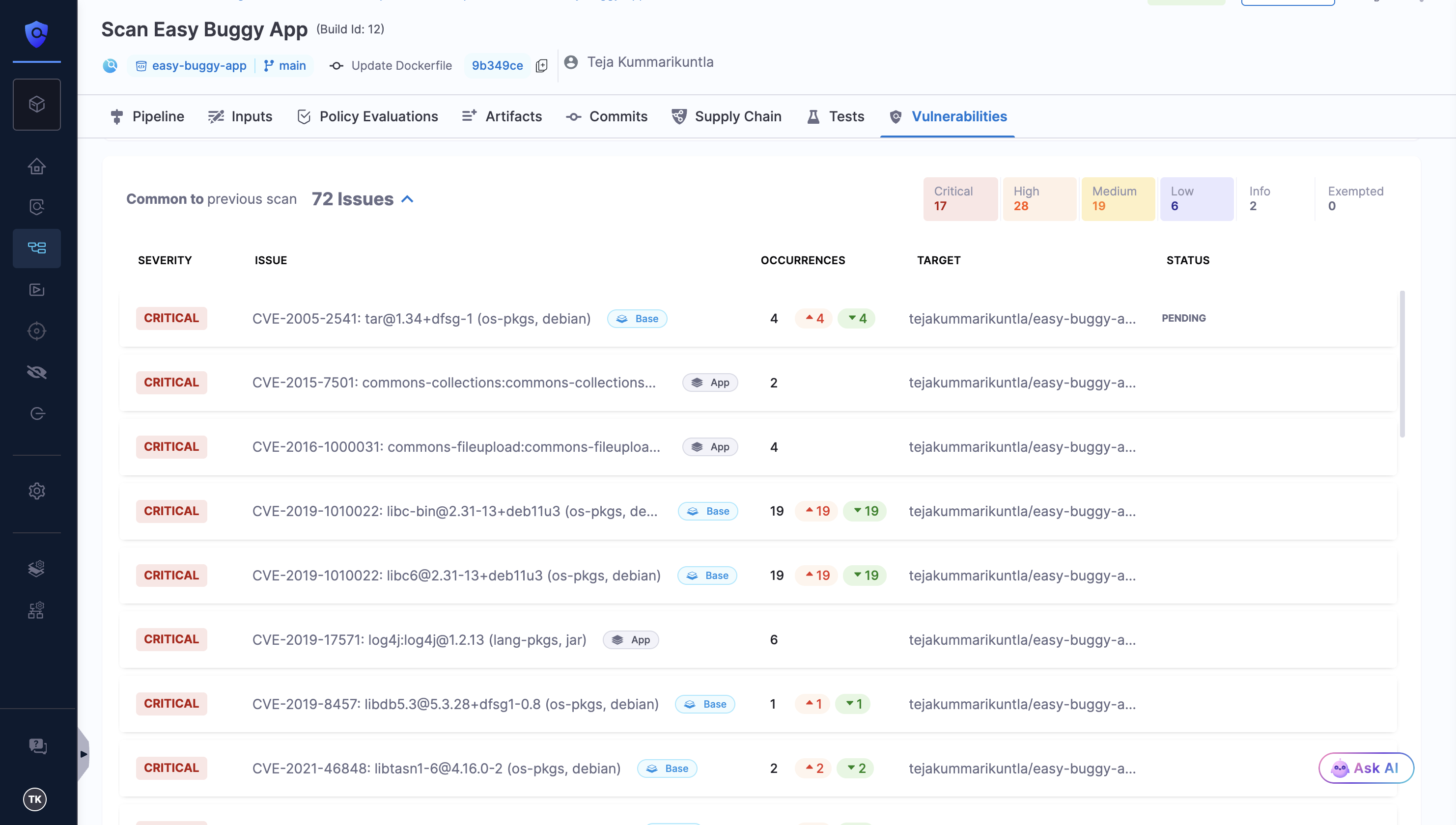 Base: These are the vulnerabilities detected in the base image of your application.Baselabel in Blue color: vulnerabilities detected in an unapproved base image.Base Imagelabel in Green color: vulnerabilities detected in an approved base image. Refer to Approve Base Image for more details.