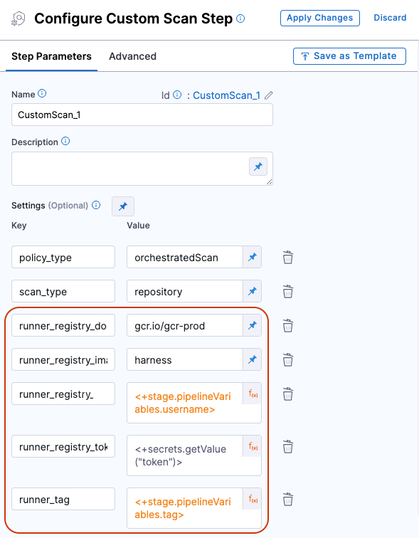 The Custom Scan step uses the sto-plugin image to launch the appropriate scanner image(internally called as runner) based on the step configuration. You have the option to either override both the sto-plugin image and the scanner image, or simply override the scanner image while keeping the sto-plugin image unchanged.