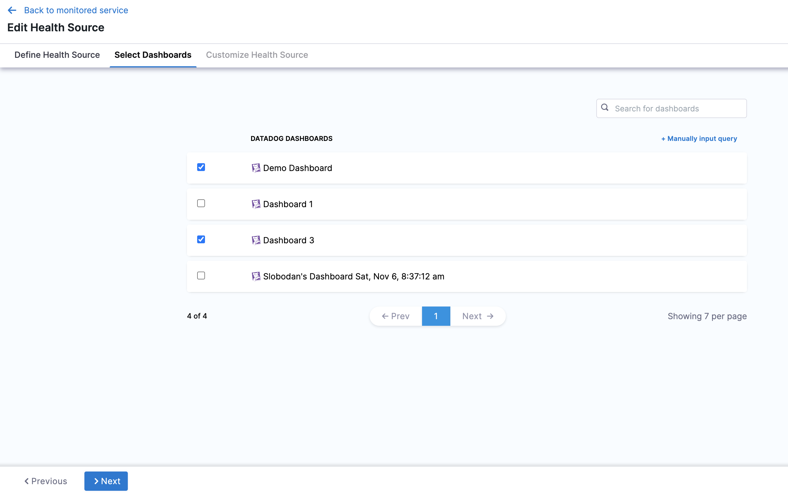 Click the dashboards of your choice. If you don't have any preexisting dashboards or don't want to select the ones in the displayed result, click Manually input query.