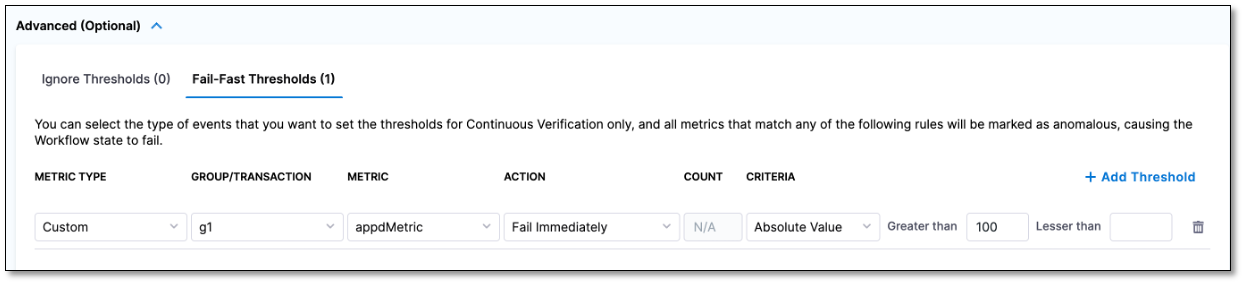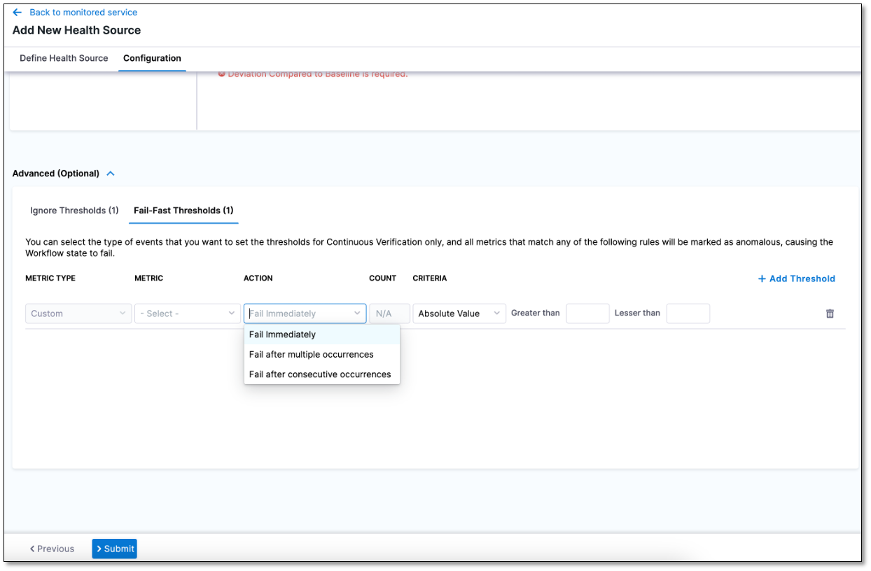 Go to the Fail-Fast Thresholds tab and select + Add Threshold.