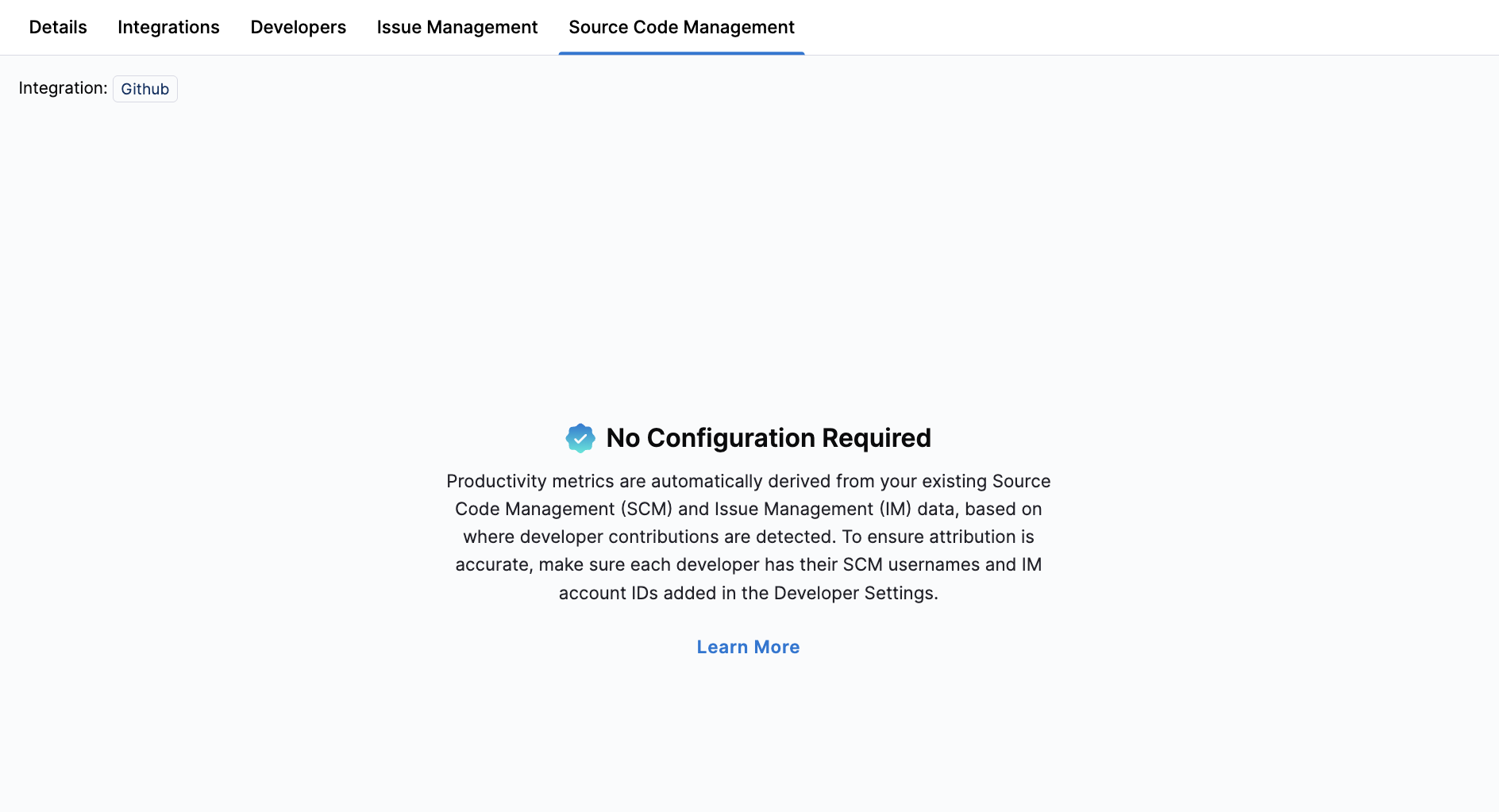 Source Code Management (SCM) settings are not required for Productivity metrics. Productivity in SEI 2.0 is measured holistically across a developer's total contributions spanning all repositories and all branches where those contributions exist.