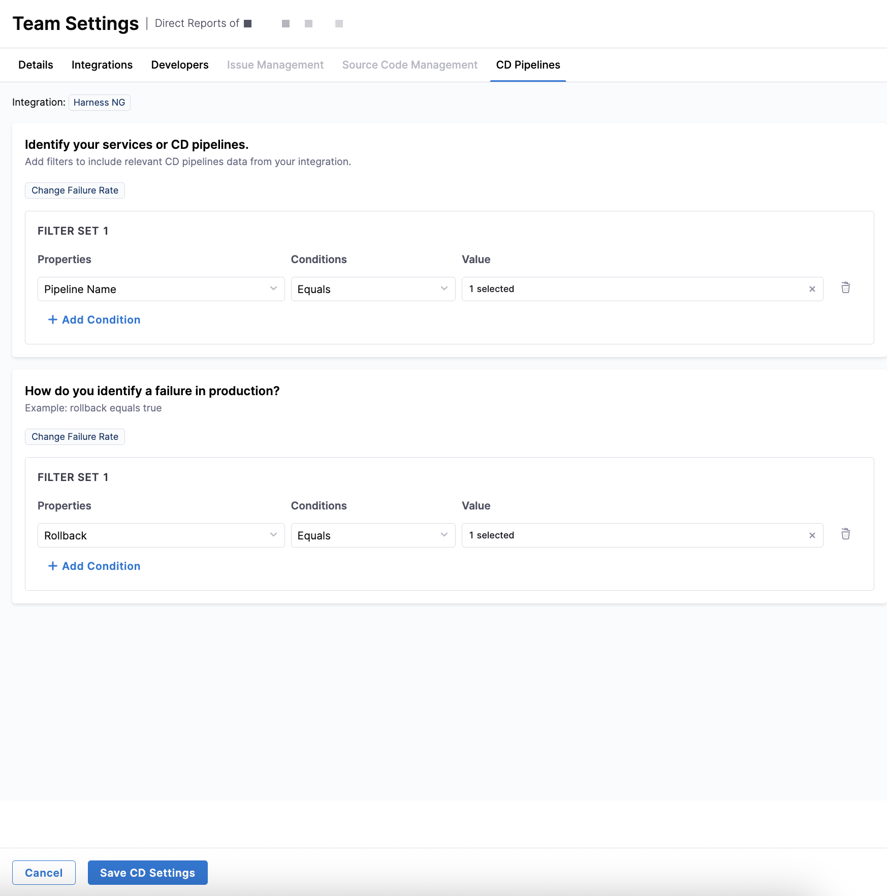After completing all CD Pipelines filters, click Save CD Settings to apply the configuration to the team.