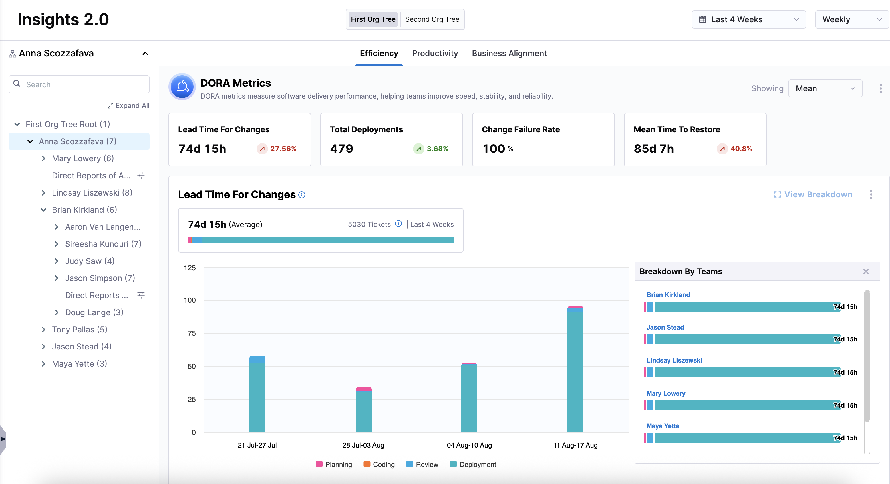 You can interact with the graphs to see breakdowns by stages (Planning, Coding, Review, Build, or Deployment) or by team.