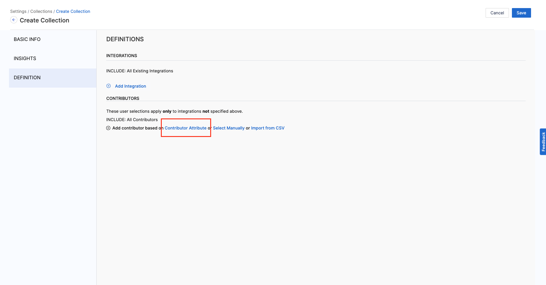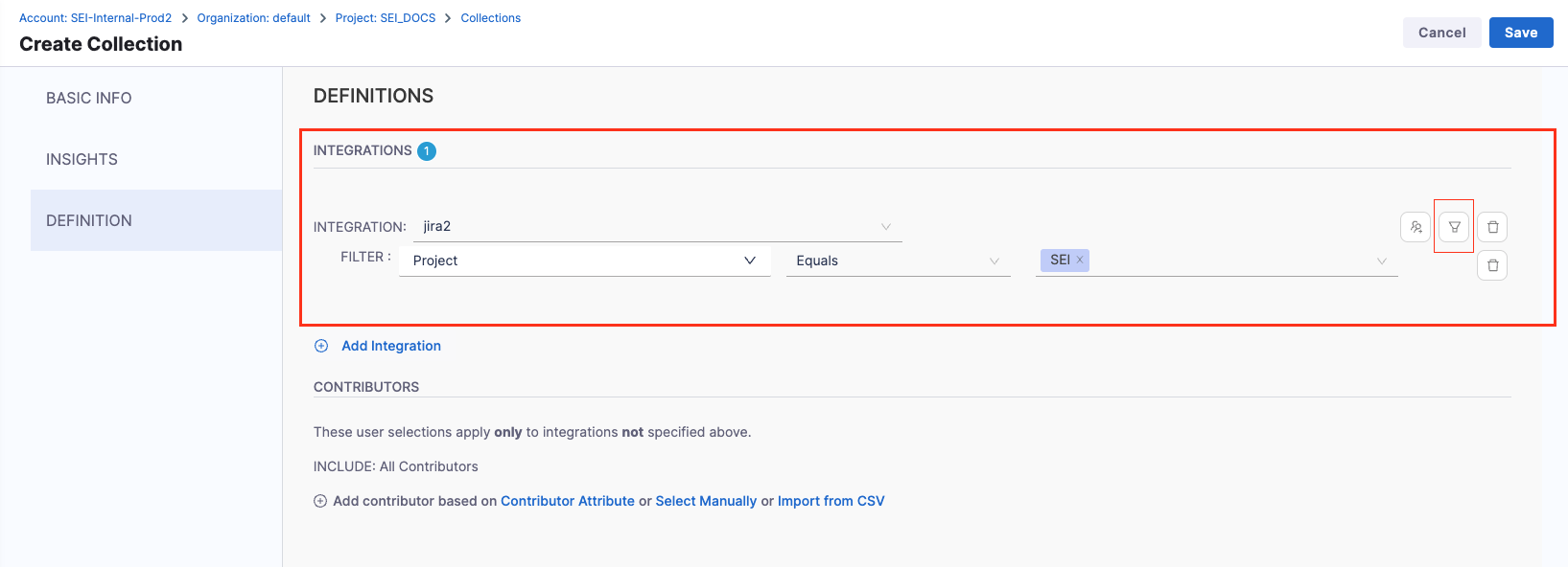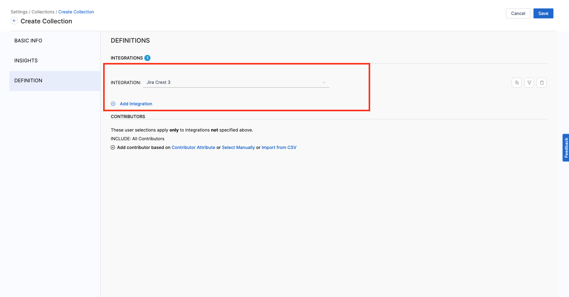 1. Add the Integration Filters to determine the criteria to associate Contributors with the Collection.