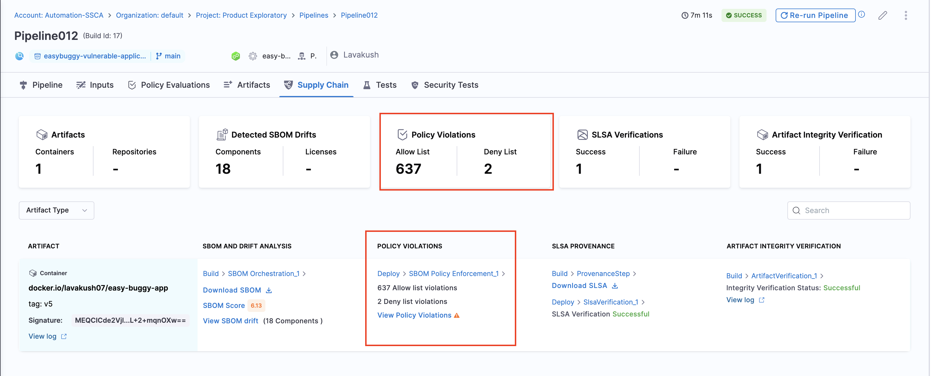 - Records policy violations and shows them on the Supply Chain tab on the Execution details page.