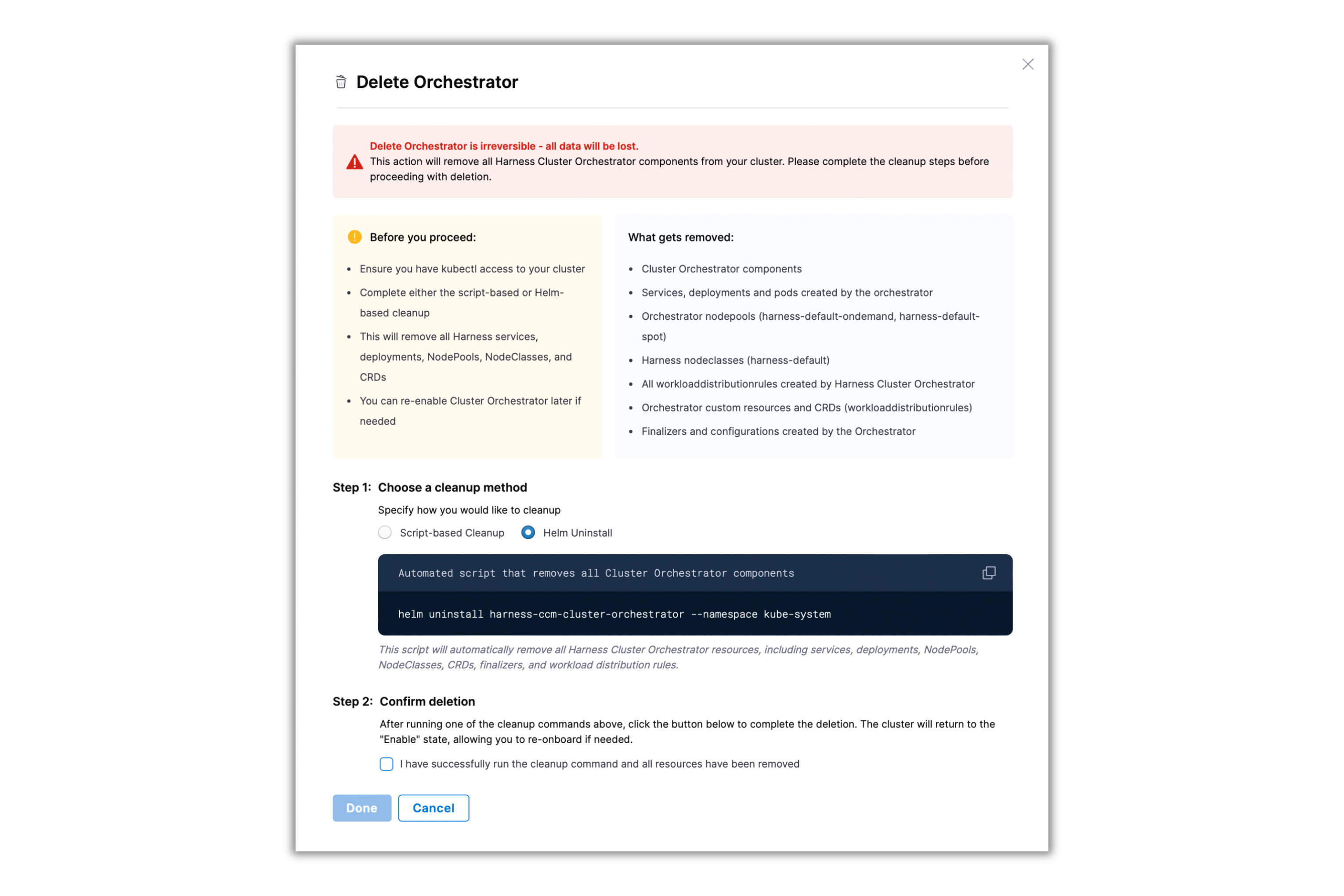 - Cluster Orchestrator Deletion: We have added a deletion flow for Cluster Orchestrator, enabling users to fully remove all orchestrator resources and revert clusters via API, script, or Helm uninstall. This operation is only available for disabled clusters. [CCM-26694]